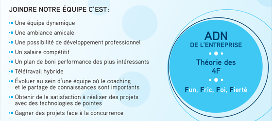 Tu auras l'occasion de te joindre à une équipe talentueuse et expérimentée dans une entreprise en forte croissance qui est reconnue sur le marché pour son expertise technique de pointe en services professionnels.